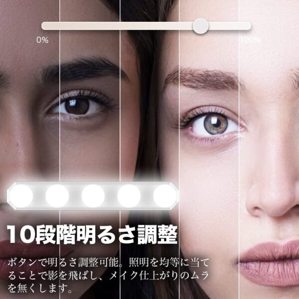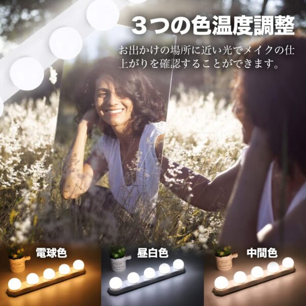 - 【色温度3段階調節】3つの照明モード(昼白色、電球色と中間色)を自由に選択できます。お出かけの場所に近い光でメイクの仕上がりを確認することができます。