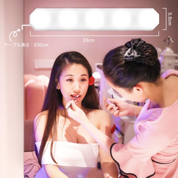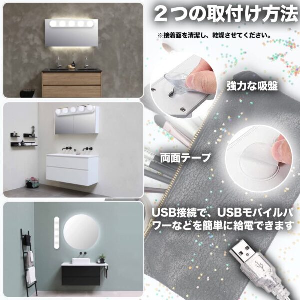 - 【取り付け簡単】穴あけ不要で、2種類の簡単な取り付け方法があります。2枚の両面テープと強力な吸盤2個付き、持ち運び便利で場所を選ばず使えますから、化粧、照明、装飾、写真撮影などに複数のバニティライトを適用できます。